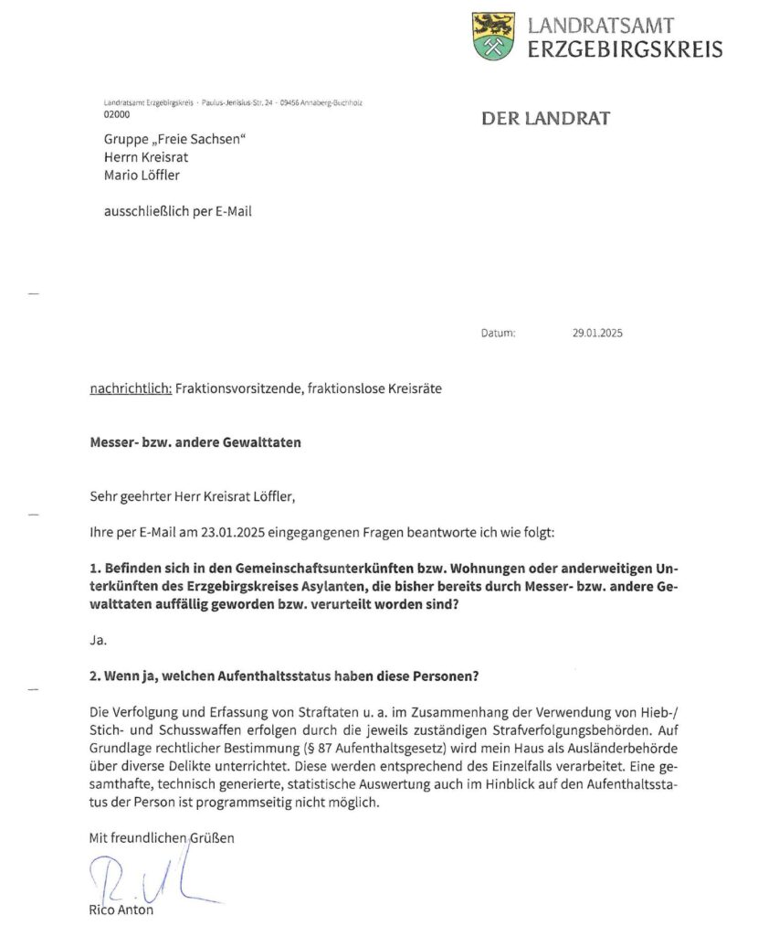 Wie aus der Antwort von CDU-Landrat Rico Anton auf eine Anfrage von Mario Löffler hervorgeht, befinden sich auch in unserem Landkreises „Asylanten“, die bereits durch Messer- bzw. andere Gewalttaten auffällig bzw. verurteilt worden sind. Eine „Auswertung im Hinblick auf den Aufenthaltsstatus dieser Personen ist programmseitig nicht möglich.“ heißt es weiter.